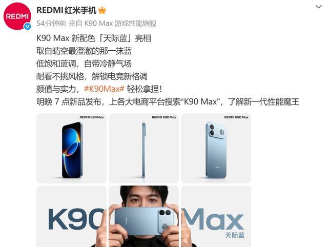 4月20日,红米手机宣布,REDMI K90 Max将于明晚7点发布,官方今日公布了新配色“天际蓝”。